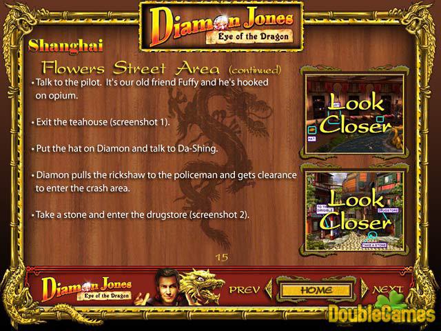 Stáhněte si zdarma strategického průvodce s názvem Download for free our Diamon Jones: Eye of the Dragon Strategy Guide učiňte tak svoji výpravu do Číny ještě zajímavější. Prohledejte zemi a najděte starodávný předmět zvaný dračí oko – Eye of the Dragon. Naučte se různé triky, které se vám cestou budou hodit. Průvodce má více než 50 stránek užitečných informací, obrázků jednotlivých scén hry, které vám pomohou pochopit snáze jednotlivé partie hry!