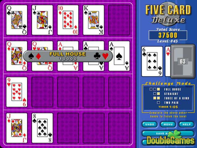 Pokud máte rádi Prší nebo poker pak budete milovat Pět karet Deluxe! Místo vydání karty na stůl, aby forma pokeru rukou a skóre bodů. Hrát jednu z 4 druhy najít vaši oblíbenou & dokonce můžete uložit své hry. Vydělejte divoké karty "Joker je z volné přírody", nebo byste porovnat skóre s ostatními z celého světa v "Turnaj" režimu