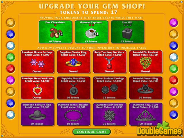 Zápas barevné drahokamy a udržet zákazníky radost! Prodat Klenoty a šperky na usmívající se zákazníky, ale dávejte si pozor - držet jim čekání příliš dlouhé a oni vám začnou nadávat. Budete se muset dát jim speciální léčbu, aby jim radost a dostat se prodej! Speciální žeton, aby bylo možné provést upgrade vašich shop s více šperků a zákazník zachází. Happy zákazníci utratit hodně peněz a udržet vaše gem shop otevřen pro podnikání!