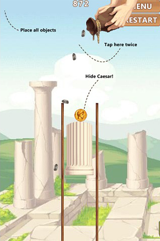 Vítejte u nové, zábavné HTML 5 hry Hide Caesar! Jedná se o logickou záležitost na motivy klasického tématu starověkého Říma, ve které má váš hlavní hrdina za úkol pokládat na herní pole nejrůznější předměty tak, aby zcela pokryly románskou minci. Pokud se však této mince dotýká nějaký kámen nebo vám spadne v nestřežený okamžik na zem, prohráváte a musíte začít úplně znovu od začátku. Vyberte myší patřičný předmět a umístěte ho správně na dané místo a hlavně, užijte si s titulem Hide Caesar spoustu zábavy. Hru můžete na svém mobilním zařízení začít hrát ještě dnes a zcela zdarma!