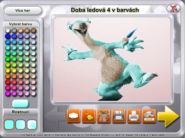 Vaši oblíbení hrdinové Manfred, Diego a Sid se poté, co se jejich pevnina uvolnila, vydávají na nové dobrodružství. Využijí tak velký ledovec a vrhnou se na prozkoumávání nového světa. Připojte se k nim v nové jedinečné a nesmírně zábavné hře Doba ledová 4 v barvách! Vybarvěte všechny postavy a postarejte se o to, aby vypadaly jako živé. Vyberte si ty nejvhodnější barvy, zvolte obrázek a začněte si hrát. Zařaďte tuto vybarvovačku do své sbírky nebo ji hrejte právě teď zcela zdarma. Užijte si ve společnosti Diega, Sida a dalších spoustu skvělé zábavy. Věříme, že se vám tato hra bude líbit! Příjemnou zábavu!
