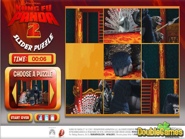 Název této hry Kung Fu Panda 2 Puzzle Slider hovoří sám za sebe. Jesliže máš rád film Kung Fu Panda a zbožňuješ legračního méďu, rozhodně ti doporučujeme, aby sis zahrál tuto nejnovější online hru! Ve této hře, Kung Fu Panda 2 Puzzle Slider, si můžeš vybrat z několika obrázků, které jsou jsou ze scenérie filmu Kung Fu Panda 2. Vybral jsi si fregment? No a nyní máš puzzle. Nemusíš puzzle sestavovat z roztýlených částí, ale jedoduše posunovat části dokud obraz není hotový. Zahraj si online Kung Fu Panda 2 Puzzle Slider a u užij si hodiny této návykové hry.