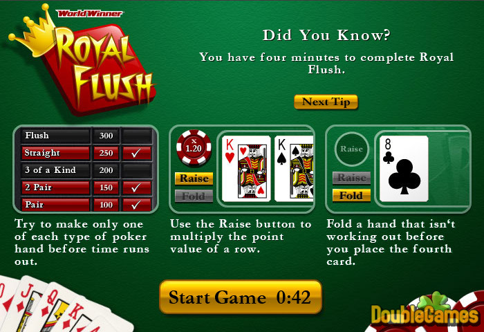 Hrací karty dostává popularita dávno. Pomáhají trávit volný čas pro miliony lidí na celém světě! Některé karetní hry jsou tak jednoduché, že i děti mohou hrát ně! Ale, samozřejmě, tam jsou některé opravdu složité, že poptávka od vás hodně zručnosti a mistrovství! "Royal Flush" je hra, která kombinuje 2 není jednoduché hry: Solitaire a Poker. Musíte být skutečný mistr vyhrát a získat skóre!