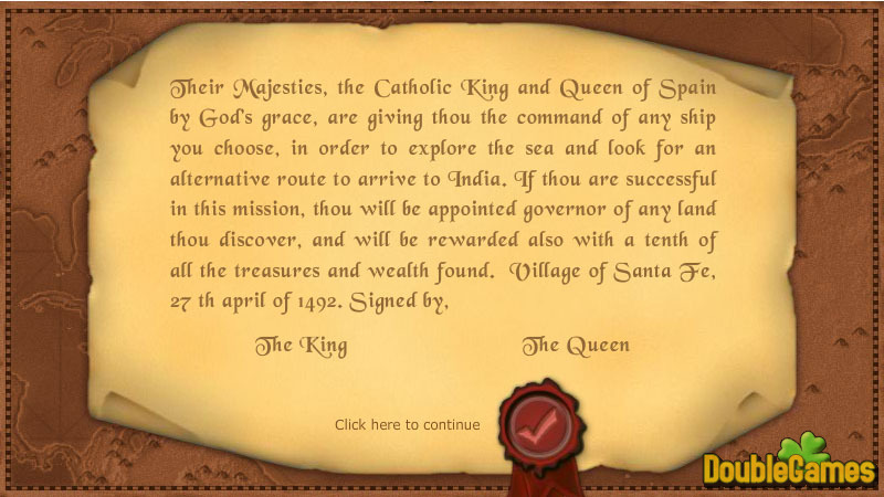 Jejich veličenstvo, katolický král a královna Španělska Boží milosti, jsou ty potápění velení každé lodi, kterou vyberete, za účelem prozkoumání moře a hledat alternativní trasu, aby se dostali do Indie. Pokud jste úspěšný v této misi, když bude jmenován guvernérem pozemku jsi objevovat, a budou odměněni také s desetina všech pokladů a bohatství nalezeno. Takže jste se rozhodli jet na cestu a hrát roli Capitan na vaší lodi, měli byste vypadat po vaší posádky. Nedejte jim zemře!