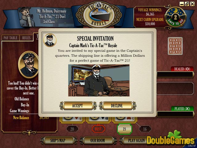 Připravte se na soubor se plaví na palubě SS-A-Tic Tac Royale, hledat nový domov a nový život! Mohli byste změnit svou budoucnost, a vytvořit svoje štěstěny, hrající Tic-Tac-A se svým shipmates předtím, než se dostanete k vašemu cíli? 9. unikátní a náročné hry Tic-Tac-A Royale kombinovat Tic-Tac-Toe s kasinové hry vytvořit hodin hraní kartou zábava. Play natolik dobře, a vy můžete vylézt z kormidlování na kapitána třídy a přeměnit od sebe pouhý chudák na milionáře!